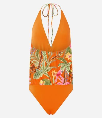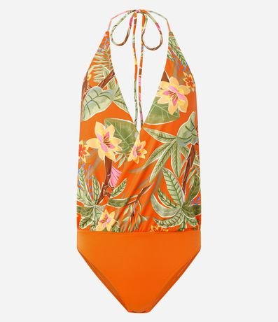 Ref: Body feminino modelo frente única confeccionado em poliéster. Possui decote profundo, amarração no pescoço, superfície com estampa folhagem e parte inferior lisa, criando visual moderno para compor produções casuais e versáteis.