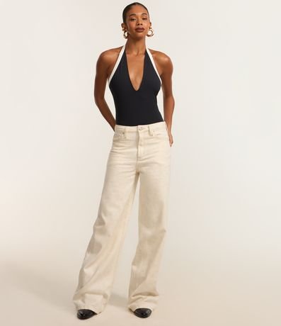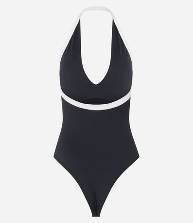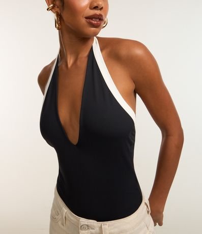 Body frente única, confeccionado em poliamida, com decote V profundo e contrastes. Peça com elastano na composição.