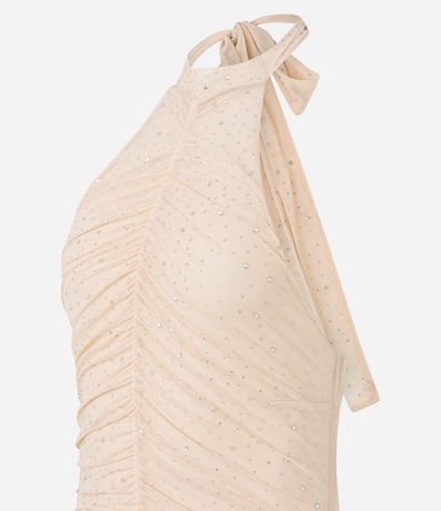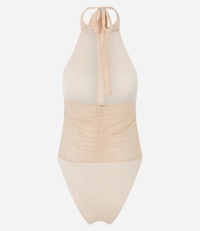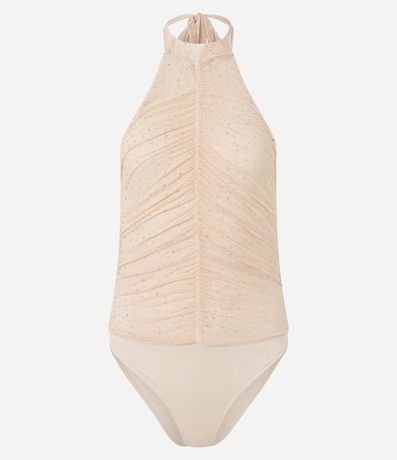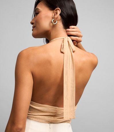 Body frente única com franzidinho, decote halter com amarração no pescoço e brilhos aplicados.