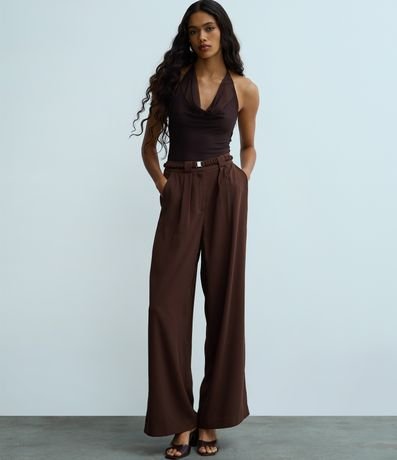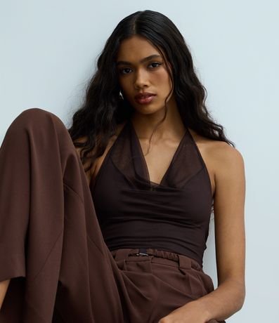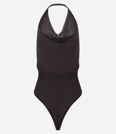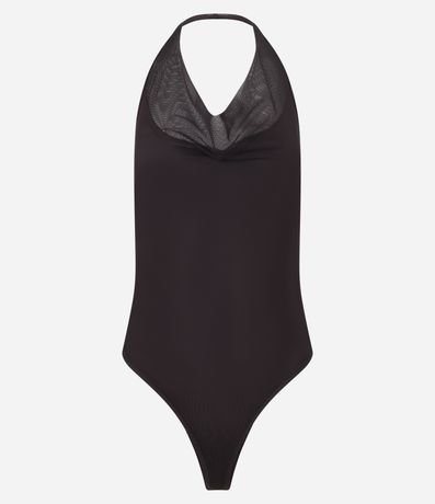 Body frente única, confeccionado em tule, com decote drapeado, costas abertas e fechamento entreperna. O decote com caimento franzido - gola boba - tem tonalidade levemente diferente. Este produto foi fabricado através de processos mais sustentáveis, sendo ambientalmente mais responsável.