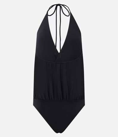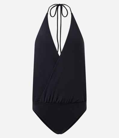 Ref: Body feminino frente única confeccionado em poliéster. Possui decote profundo em V transpassado, alças estilo halter ajustáveis por amarração na nuca e cintura levemente franzida para melhor caimento.
