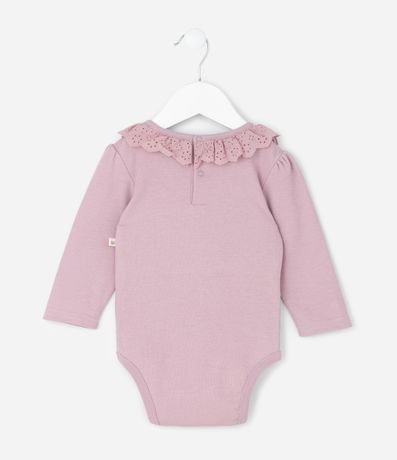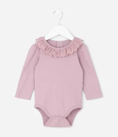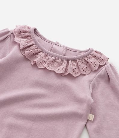 Ref: Body infantil confeccionado em meia malha macia, com gola americana e babado broderie delicado que acrescenta charme ao visual. Possui mangas longas, acabamento confortável e fechamento entrepernas com botões de pressão. Confeccionado em algodão certificado BCI.