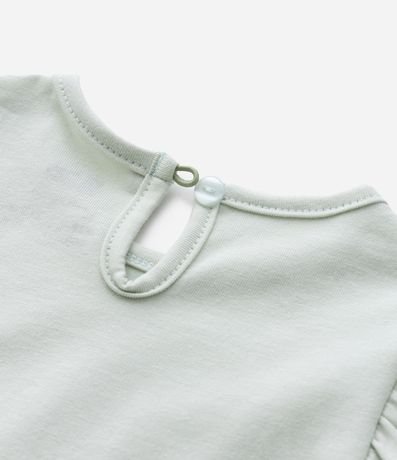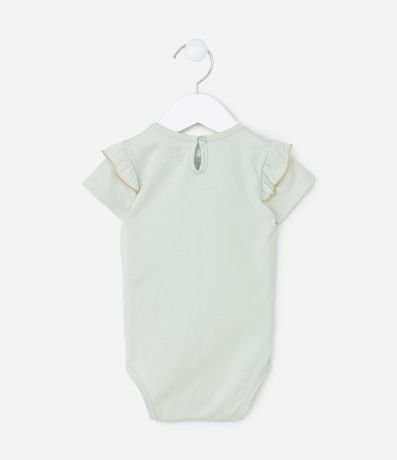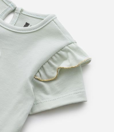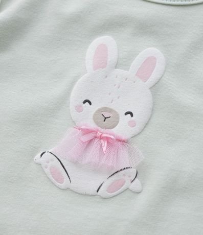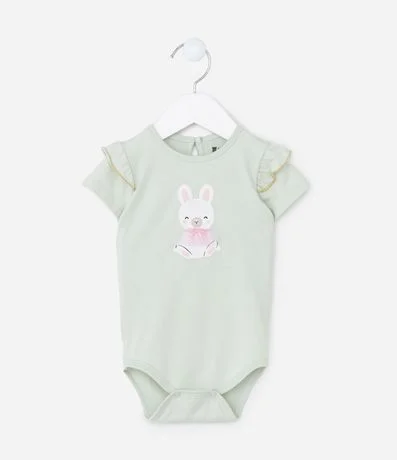 Ref: Body infantil confeccionado em algodão, com gola redonda, mangas curtas com babadinhos e fio metalizado e fechamento no entrepernas. Possui estampa de coelhinha com tule aplicado.