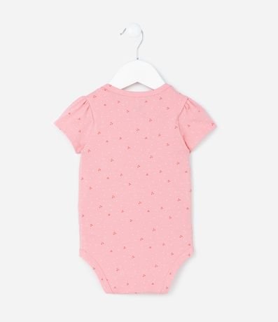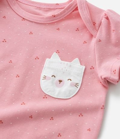 Ref: Body infantil para bebês, com gola americana, mangas curtas e bolso com estampa de gatinha. A peça é confeccionada com boas práticas ambientais e algodão certificado bci.