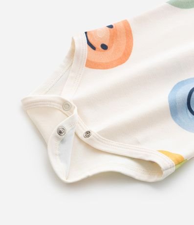 Body infantil para bebês, com gola americana, mangas curtas e estampa de carinhas sorridentes. A peça é confeccionada com boas práticas ambientais e algodão certificado bci.