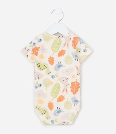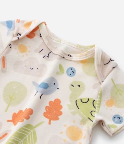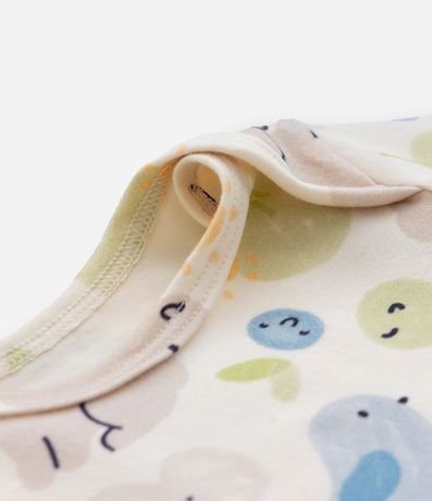 Body infantil confeccionado em algodão certificado BCI e boas práticas ambientais. Possui gola americana, mangas curtas e fechamento entrepernas por botões de pressão. Apresenta estampa fullprint de animais coloridos, garantindo praticidade.