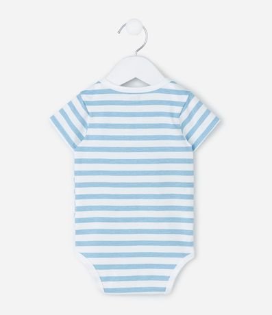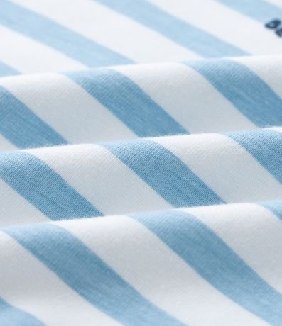 Body infantil confeccionado em algodão certificado BCI, com gola americana, mangas curtas e estampa localizada de coelho com detalhe escrito. Possui listras fullprint, acabamento reforçado nas bordas e fechamento entrepernas por botões de pressão que facilita o vestir diário.