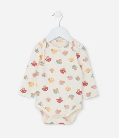 Ref: Body infantil confeccionado em algodão mais sustentável, com gola americana, manga longa e estampa cogumelos. Possui fechamento no entrepernas.