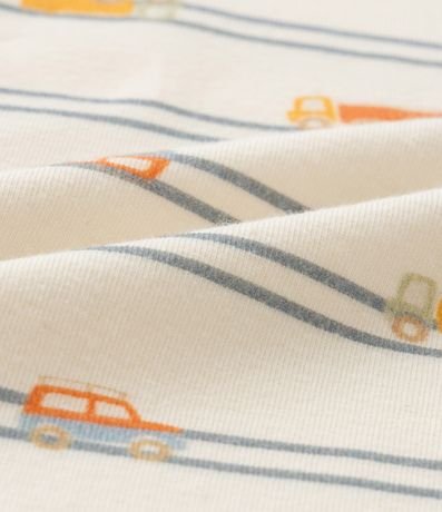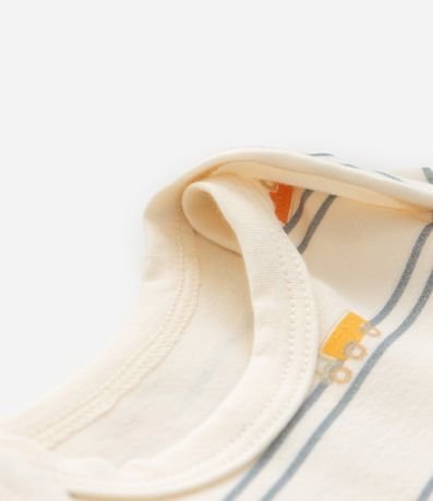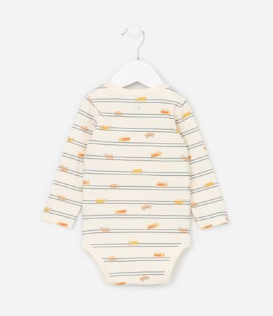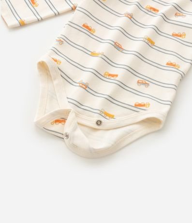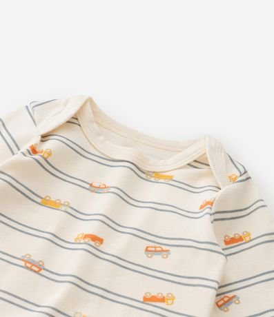 Ref: Body infantil confeccionado em algodão mais sustentável, com gola americana, manga longa com estampa de listras e carrinhos. Possui fechamento no entrepernas.