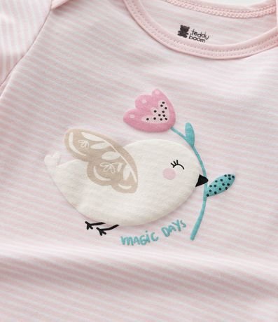 Body infantil confeccionado em cotton mais sustentável. Possui gola americana, manga curta, estampa de passarinho carregando flor, listras e fechamento no entrepernas.