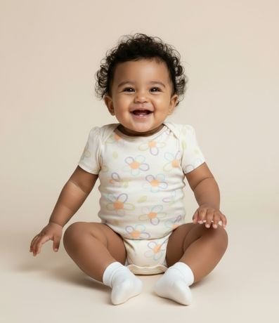 Ref: Body infantil com mangas curtas, fechamento no entrepernas e estampa floralzinha. A peça é confeccionada com algodão certificado bci.