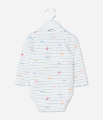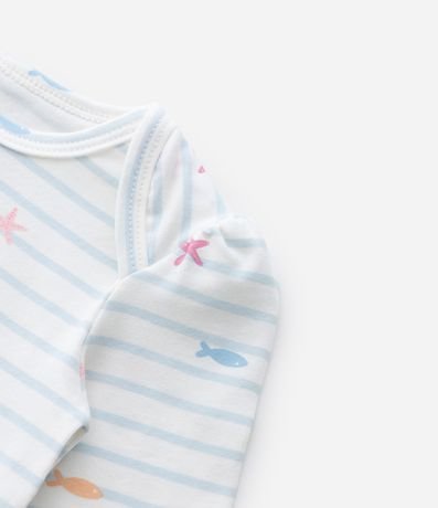 Body infantil confeccionado em cotton mais sustentável através de boas práticas ambientais, com gola americana, manga longa, estampa fundo do mar, listrado e fechamento no entrepernas.