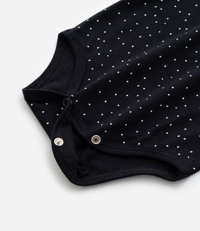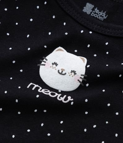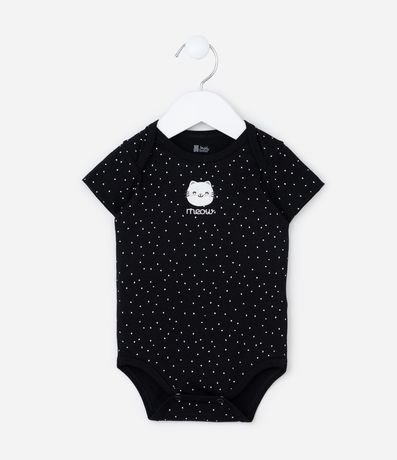Body infantil para bebês, com gola americana, mangas curtas e estampa de gatinha e poá. A peça é confeccionada com boas práticas ambientais e algodão certificado bci.