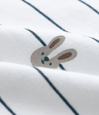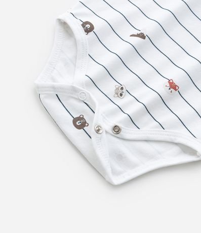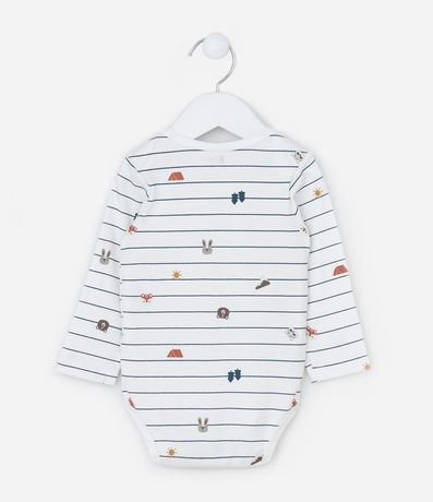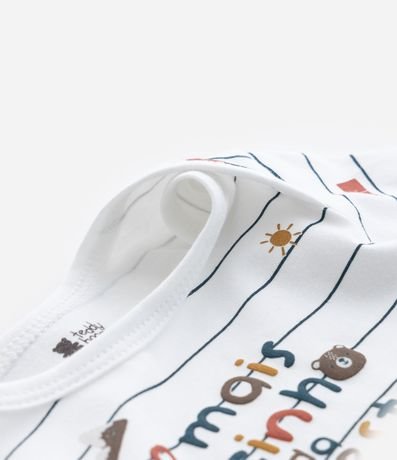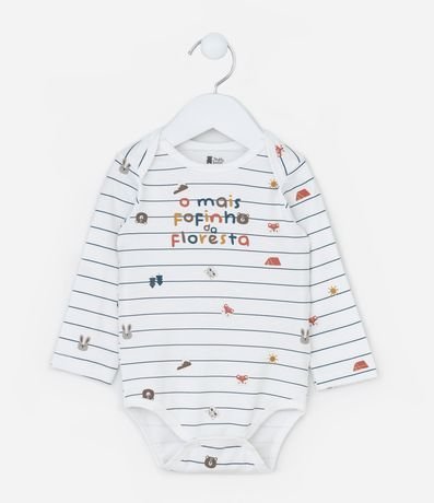 Ref: Body infantil com mangas longas, fechamento no entrepernas e estampa lettering "O mais fofinho da floresta", com fundo de bichinhos e listras. A peça é confeccionada com boas práticas ambientais e algodão certificado bci.