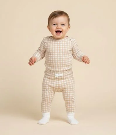 Body infantil confeccionado em cotton mais sustentável através de boas práticas ambientais, com gola americana, manga longa, com estampa xadrez vichy com corações e possui fechamento no entrepernas.