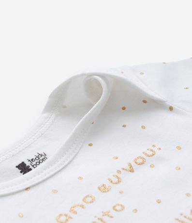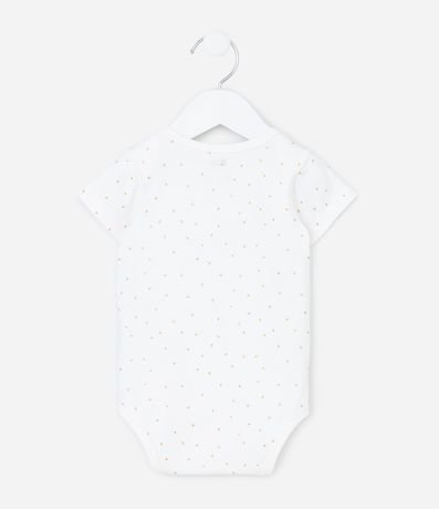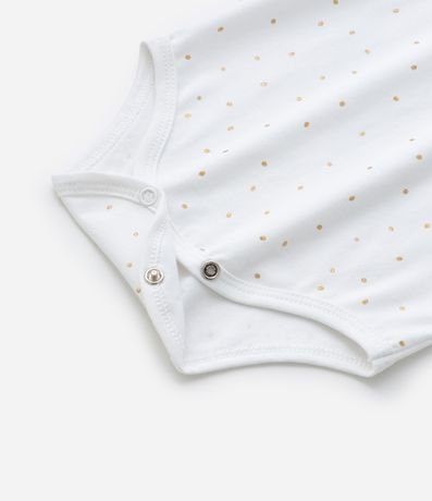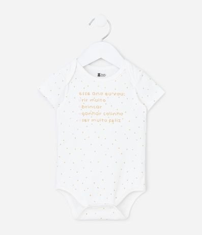 Ref: Body infantil confeccionado em algodão mais sustentável, com gola americana, manga curta, estampa poá, frases de Ano novo e fechamento no entrepernas.