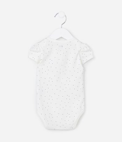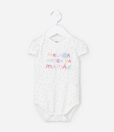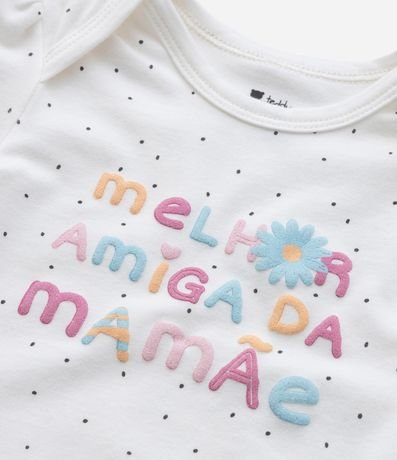 Ref: Body infantil confeccionado em algodão, com gola americana, mangas curtas, fechemento no entrepernas, estampa em poá e frase fofa "Melhor amiga da mamãe".