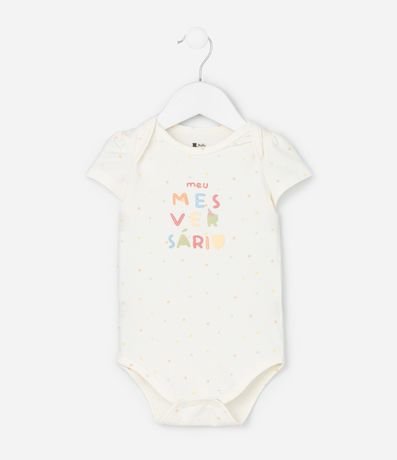 Ref: Body infantil confeccionado em algodão mais sustentável, com gola americana, manga curta e lettering "Meu mesversário". Possui fechamento no entrepernas.