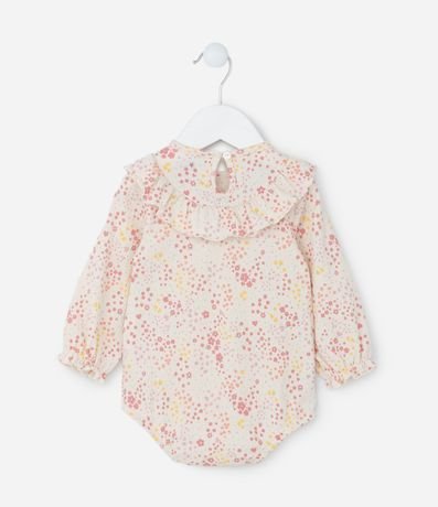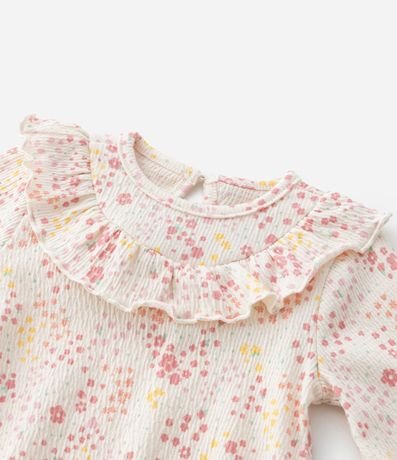 Body infantil texturizado, com gola redonda, mangas longas, fechamento no entrepernas e por gota nas costas. Possui estampa floral e babadinho na gola.