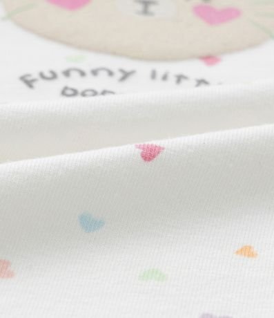 Body infantil confeccionado em algodão, com gola americana, mangas curtas, fechamento no entrepernas por pressão, estampa de gatinha e mini corações e lettering Funny little baby girl.