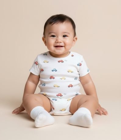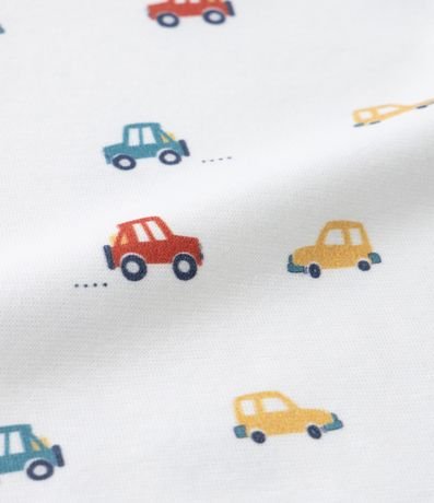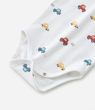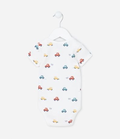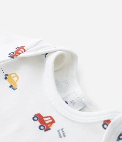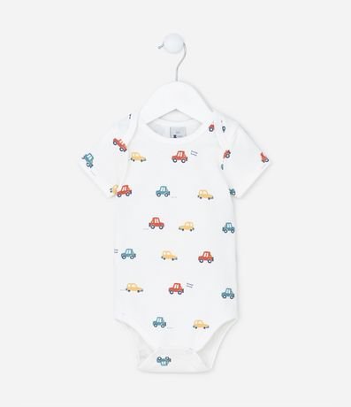 Ref: Body infantil de bebê, confeccionado em malha de algodão com elastano, com gola redonda americana e mangas curtas. Possui estampa de carrinhos e fechamento entrepernas com botões.