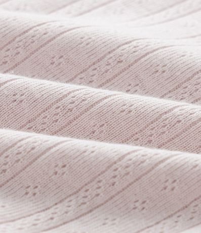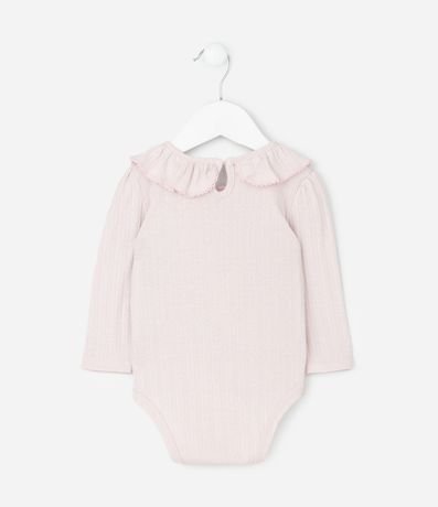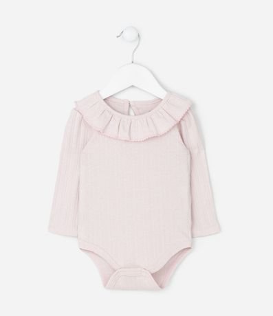 Ref: Body infantil confeccionado em algodão certificado BCI, com textura pointelle delicada e toque macio. Possui gola boneca com babado, mangas longas, abertura nas costas com botão e fechamento entrepernas por botões de pressão, garantindo praticidade e conforto no dia a dia.
