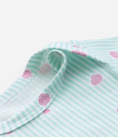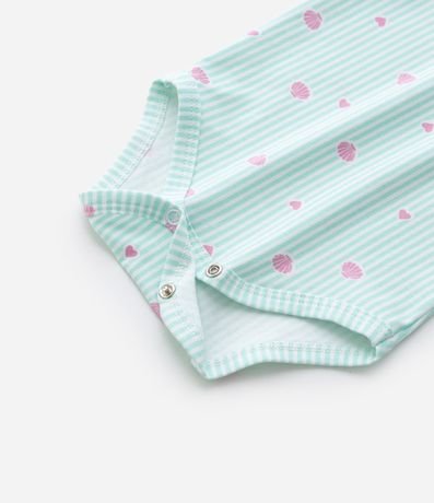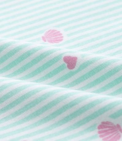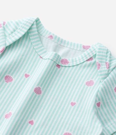 Body infantil em meia malha com listras verticais e estampa de conchas e corações distribuídos pela peça. Possui gola americana, mangas curtas e abertura inferior por botões de pressão, confeccionado em algodão certificado BCI e boas práticas ambientais.