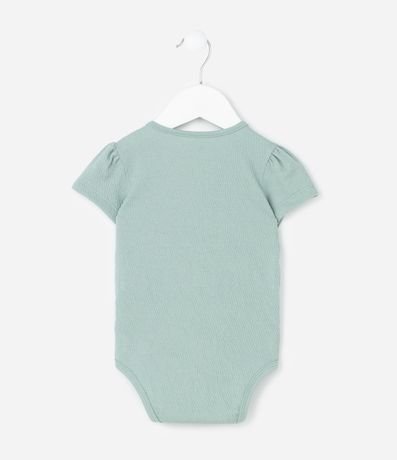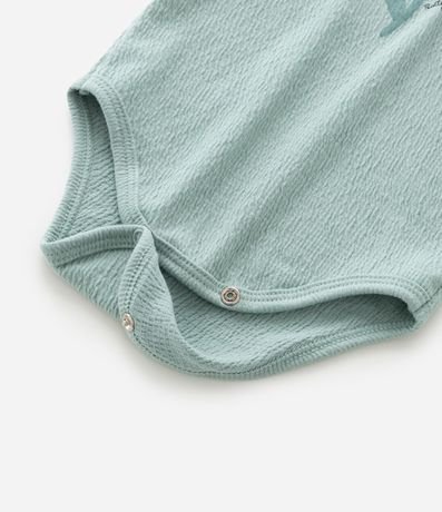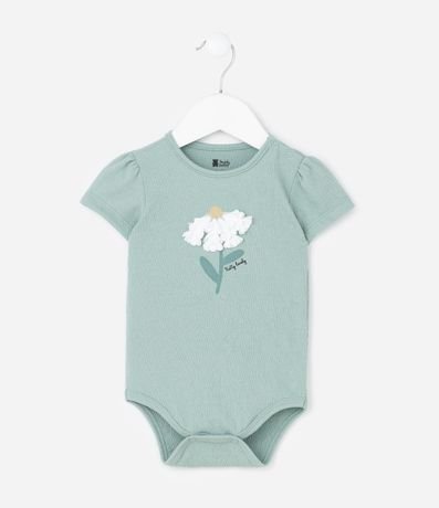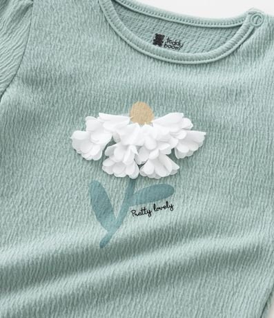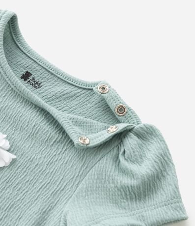 Ref: Body infantil confeccionado em algodão mais sustentável, com gola redonda, manga curta, textura e bordado de flor em organza. Possui fechamento no entrepernas.