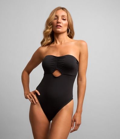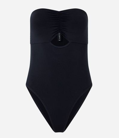 Body tomara que caia com franzidinho no busto, bojo removível, recorte vazado abaixo do busto e confeccionado em malha jersey.