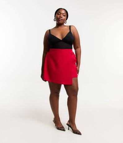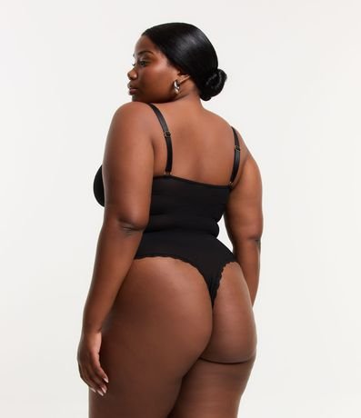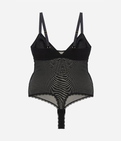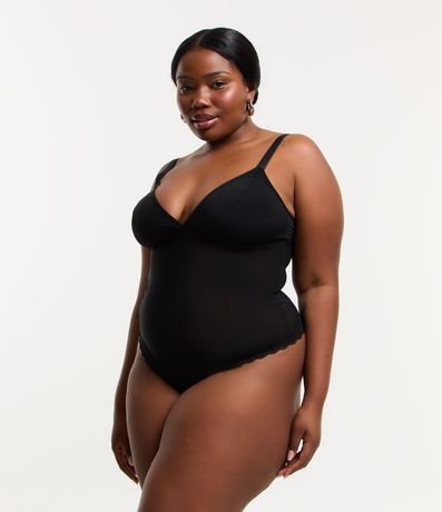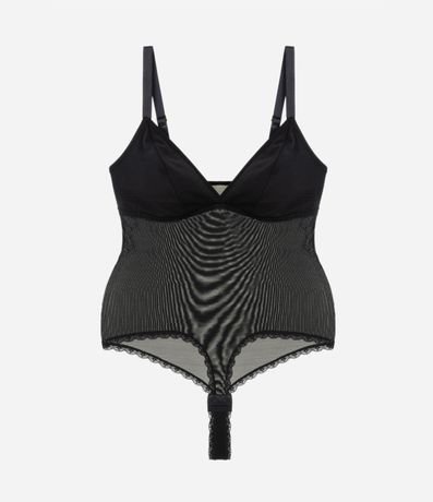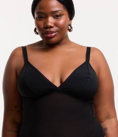 Ref: Body plus size de alcinhas finas reguláveis confeccionado em tule com decote V e rendinhas nas barras.