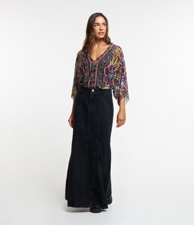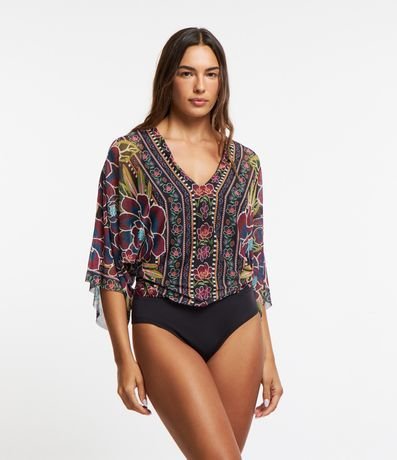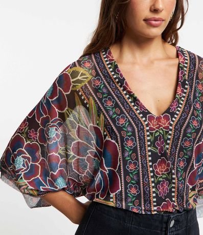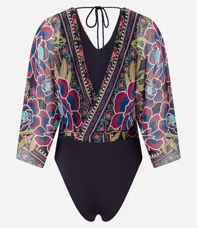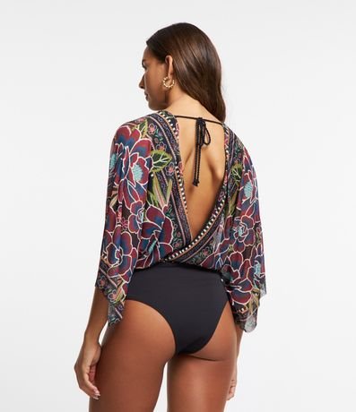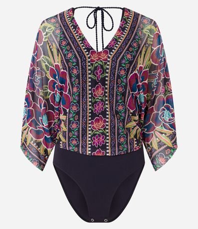 Ref: Body confeccionado em tule com decote V e costas decotadas com transpasse além de amarração por corda na região traseira do pescoço. Dispõe de fechamento entreperna, mangas 3/4 com efeito godê e estampa com tema floral tropical.