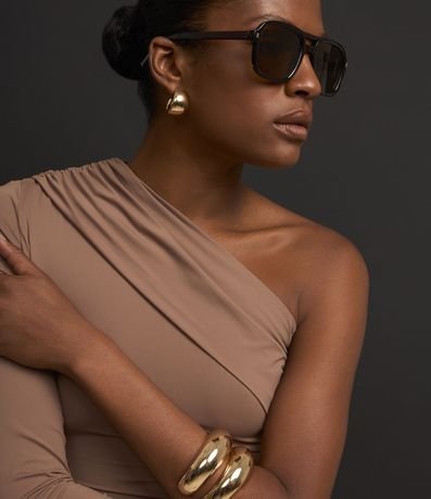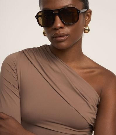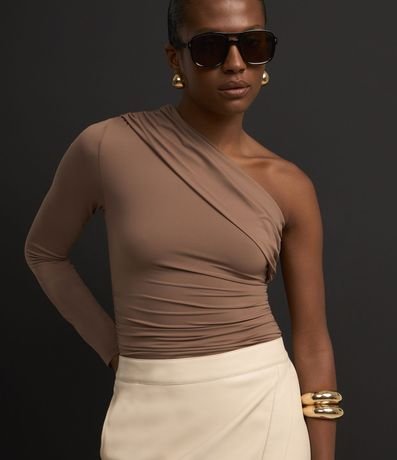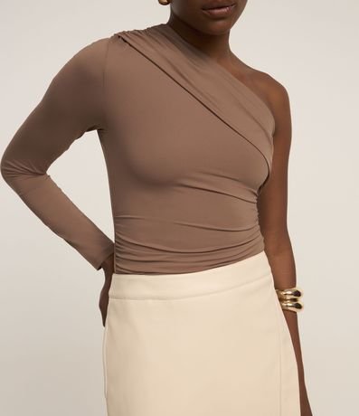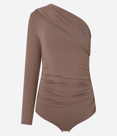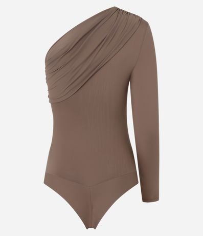 Ref: Body feminino em poliamida com ombro único, manga longa e detalhe de pregas.