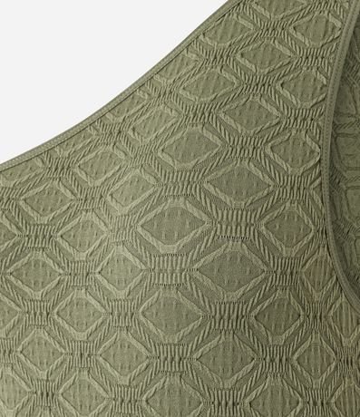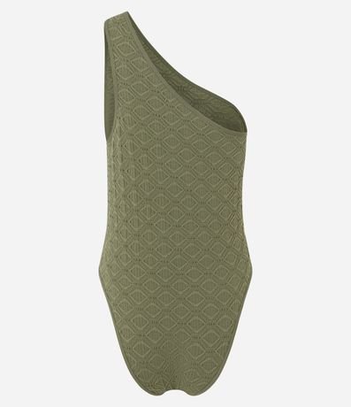 Ref: Body feminino de modelo ombro só, sem costura, com textura geométrica e fechamento no entrepernas.