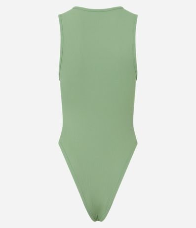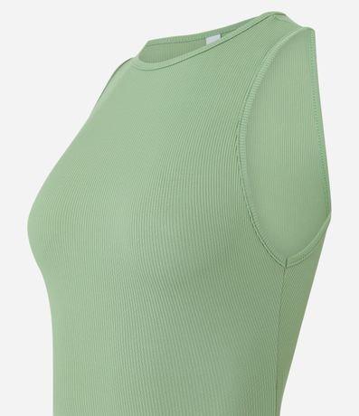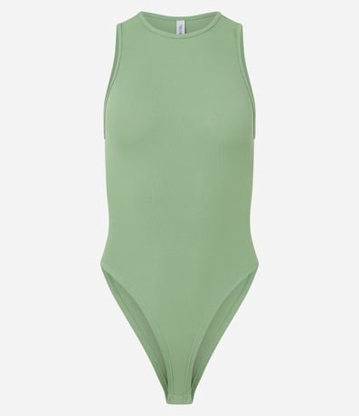 Body feminino sem mangas, confeccionado em malha ribana de poliamida geladinha, com decote redondo e abertura entrepernas.