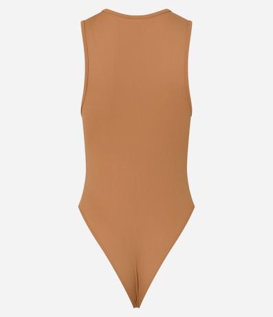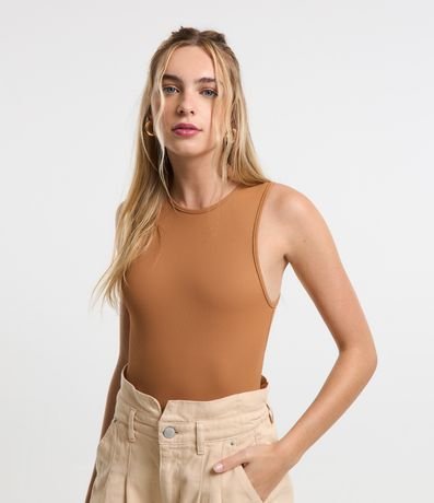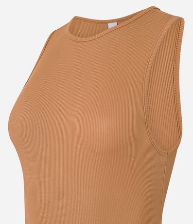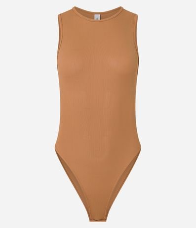Body feminino sem mangas, confeccionado em malha ribana de poliamida geladinha, com decote redondo e abertura entrepernas.