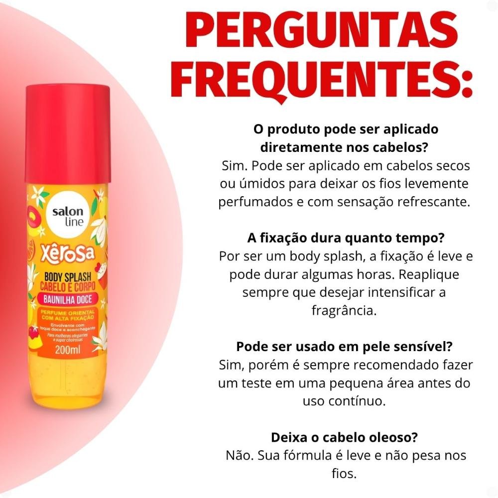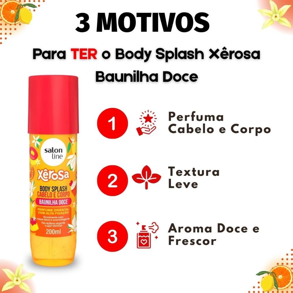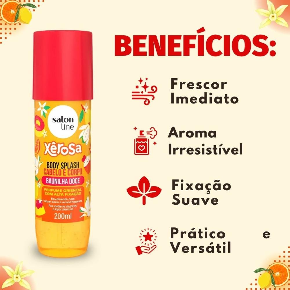 Descubra o encanto e o frescor do Body Splash Cabelo E Corpo Salon Line Xêrosa Baunilha Doce 200ml, a escolha perfeita para quem busca uma fragrância deliciosa e duradoura. Este produto inovador da Salon Line foi desenvolvido para perfumar e refrescar tanto os cabelos quanto a pele, proporcionando uma experiência olfativa única com a doçura envolvente da baunilha.