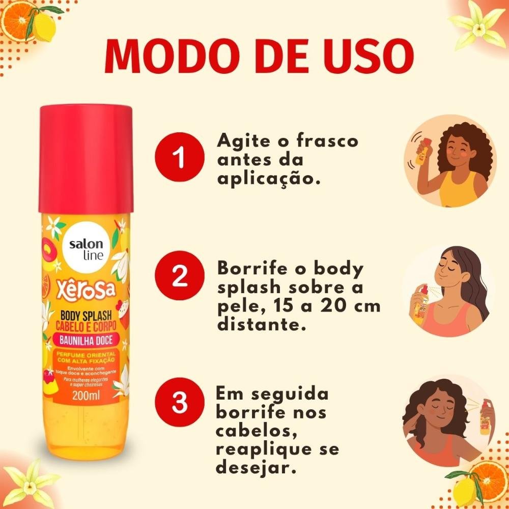 Aplique o Body Splash Cabelo E Corpo Salon Line Xêrosa Baunilha Doce diretamente sobre a pele do corpo e nos cabelos, a uma distância de aproximadamente 15 a 20 centímetros. Espalhe suavemente com as mãos para uma melhor absorção e fixação da fragrância. Reaplique sempre que desejar intensificar a fragrância e a sensação de frescor.