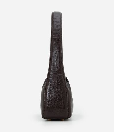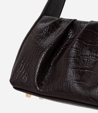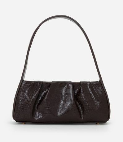 Ref: Bolsa feminina confeccionada em material sintético, com textura croco. Modelo baguete, estruturado, com fechamento em zíper, alça fixa de ombro, base reta com pés metálicos dourados.