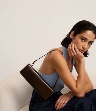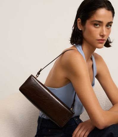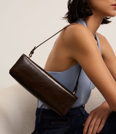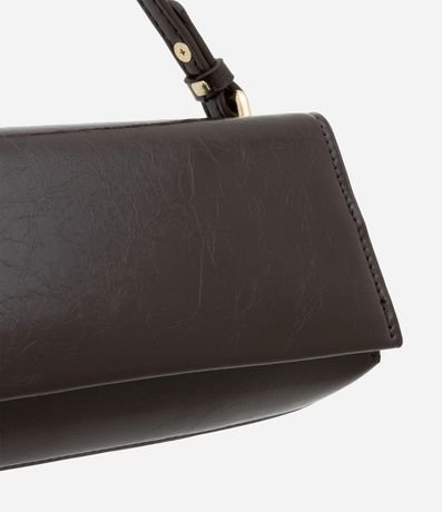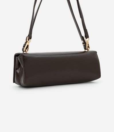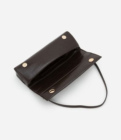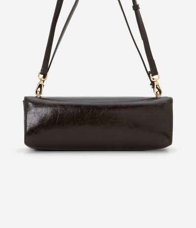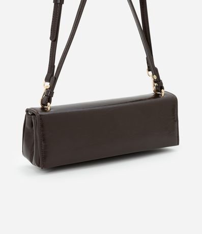 Ref: Bolsa feminina confeccionada em material sintético com poliéster certificado grs, peça pequena no modelo baguete final com tampa, botão de pressão, alça de mão, alça longa removível com detalhes em metal.