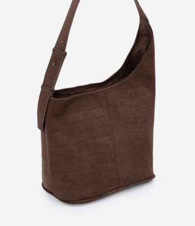 Bolsa feminina em suede texturizado com efeito croco, formato bucket com assimetria na inclinação e alça larga regulável com pinos.