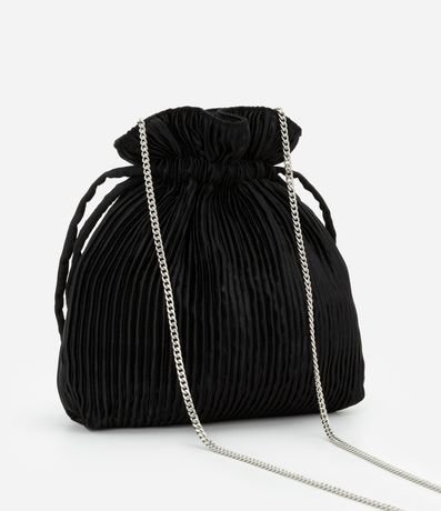 Ref: Bolsa feminina bucket pequena acetinada com fechamento por puxador, alças finas de corrente e detalhe de bordados de miçangas com forma de lagosta e caranguejo.