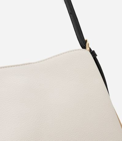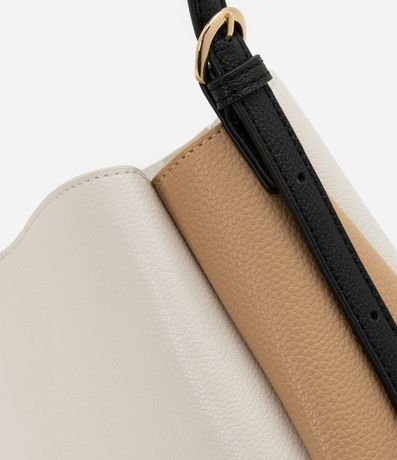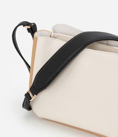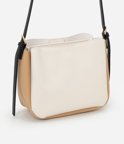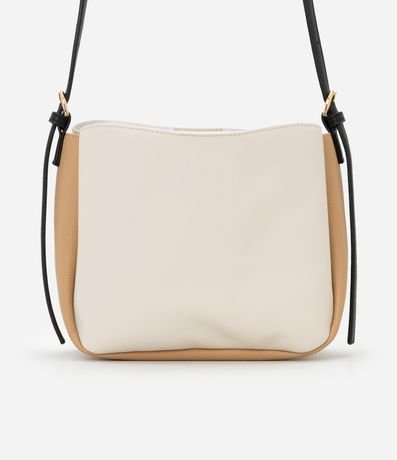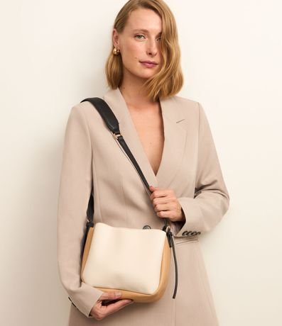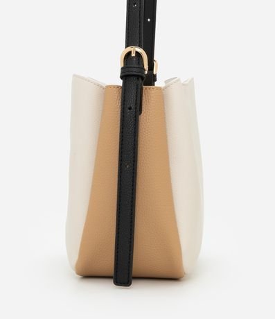 Bolsa feminina confeccionada em material sintético, peça no modelo bucket com fechamento por zíper, divisórias internas e alça longa ajustável.