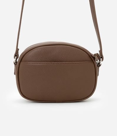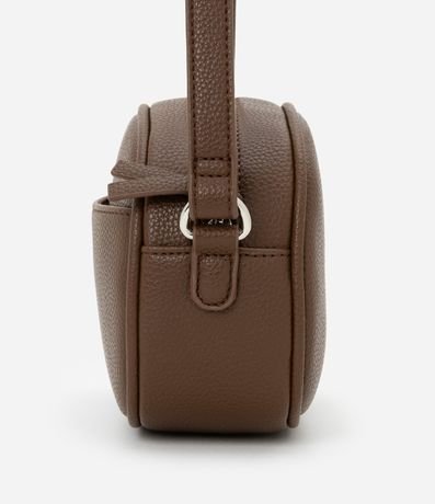Bolsa feminina pequena modelo câmera bag, arredondada, com alça ajustável, bolsinho frontal, fechamento no topo por zíper e com leve textura.