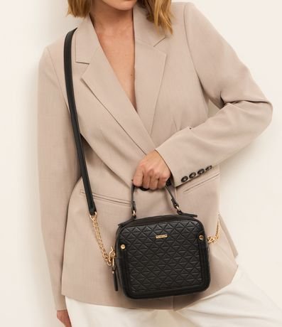 Bolsa feminina câmera bag transversal, com fechamento por zíper contrastante, alça de mão. Peça média de alça longa com detalhe de correntes contrastante removível.