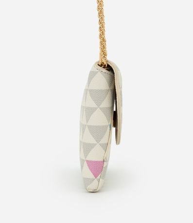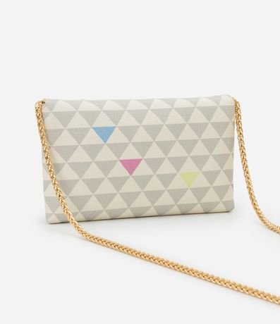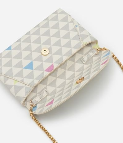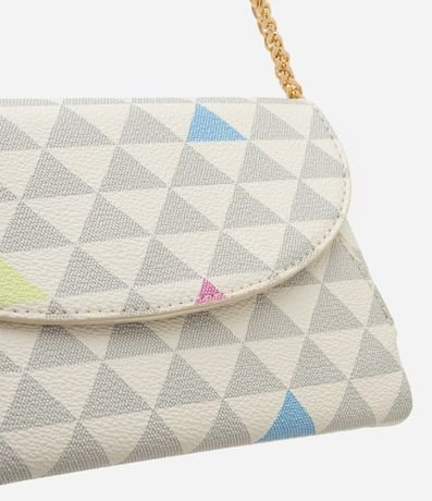 Bolsa feminina no modelo carteira grande transversal com tampa com botão de pressão, alça de corrente  e estampa de triangulo.