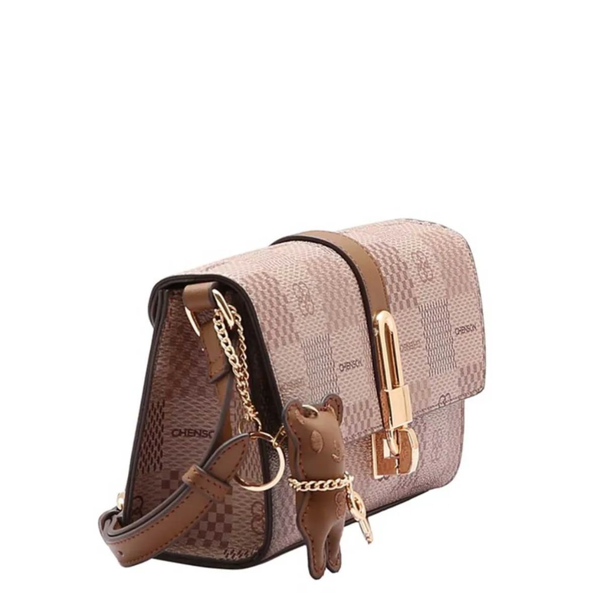 Confeccionada em PU, material de excelente qualidade, essa linda bolsa possui amplo espaco e compartimentos para pequenos objetos. O forro e em tecido personalizado com o logo Chenson. O fechamento principal e feito com ziper personalizado e botao. A alca em PU transversal e o acabamento em costura contrastante adicionam sofisticacao. Acompanha um lindo chaveiro ursinho Chenson, com detalhes das ferragens em dourado, para um toque de elegancia. Especificacoes: Tamanho: Unico Marca: Chenson Genero: Feminino