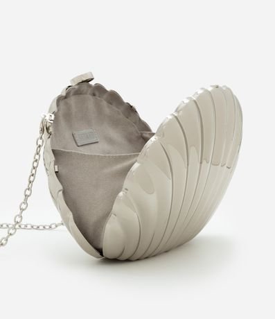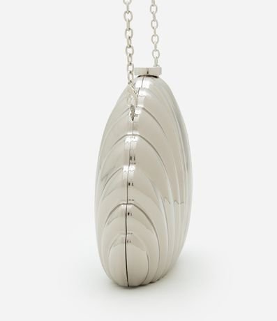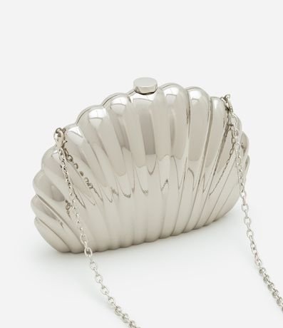 Ref: Bolsa feminina pequena em metal, modelo clutch, com alça em corrente, formato de concha e com fechamento de botão.