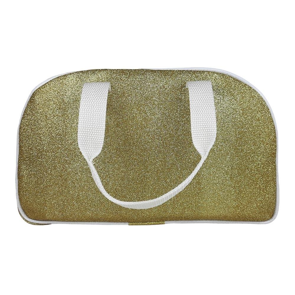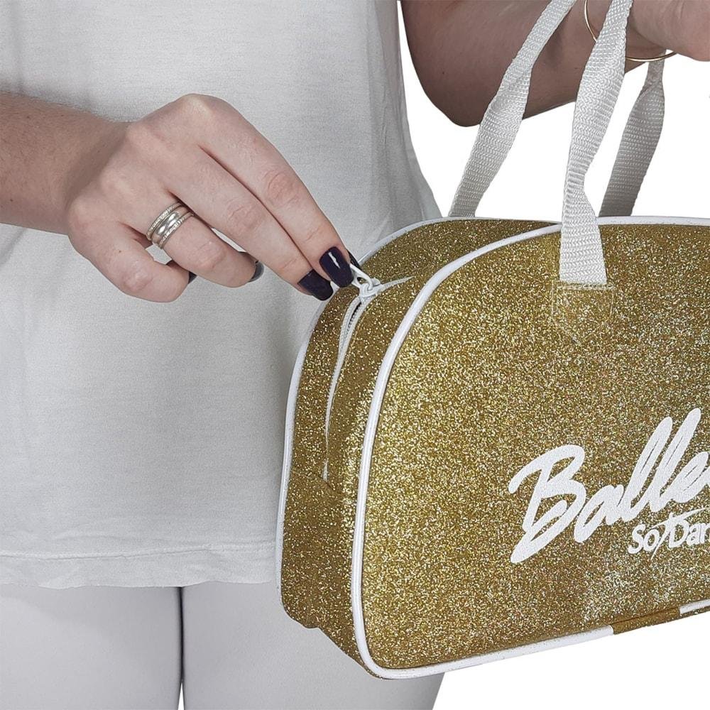 Modelo conta com um zíper principal e alças de mão. Modelo: Bolsa Gliter BG-762; Cor: Dourado; Gênero: Feminino; Marca: Só Dança; Composição: 100% Poliéster.