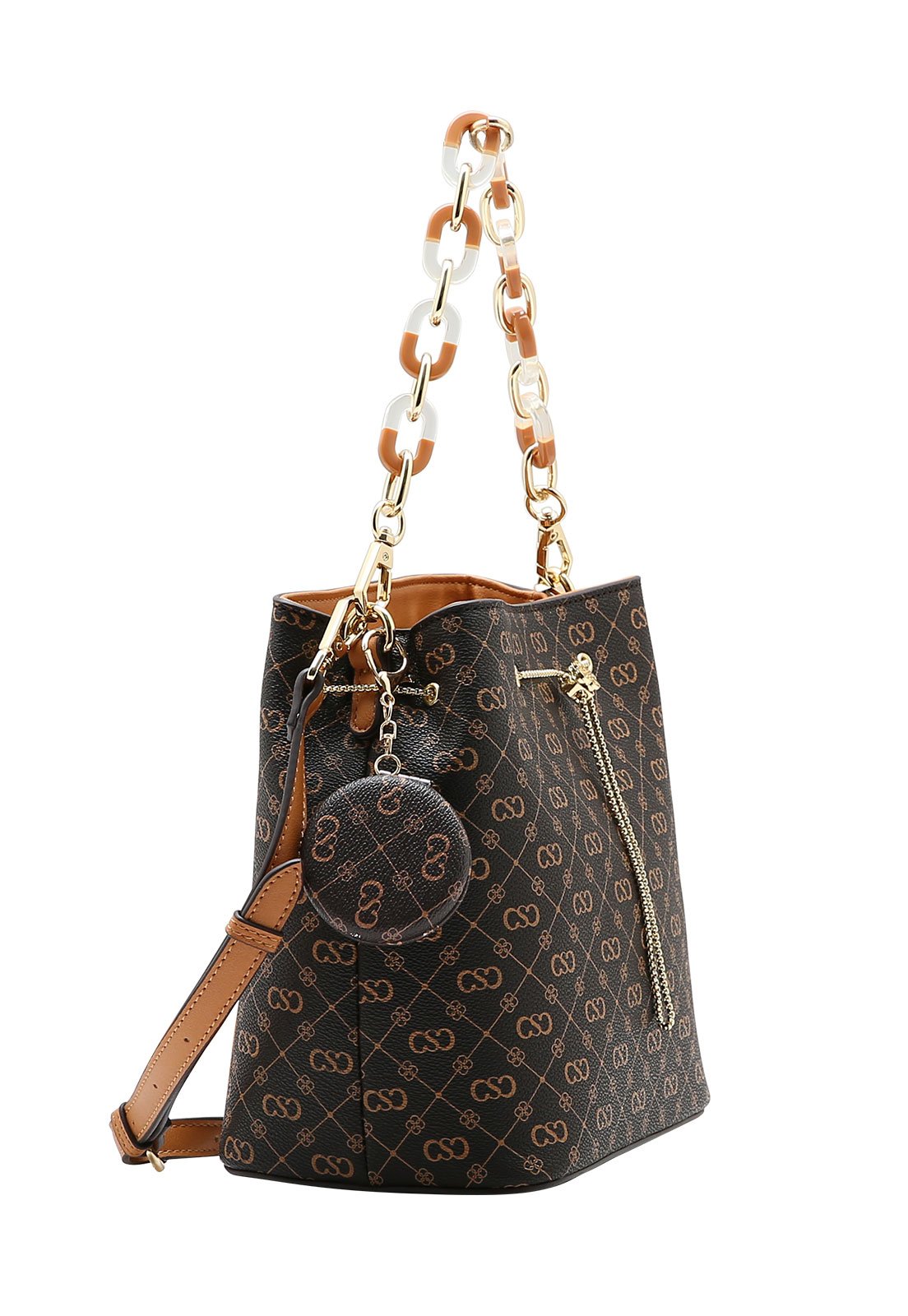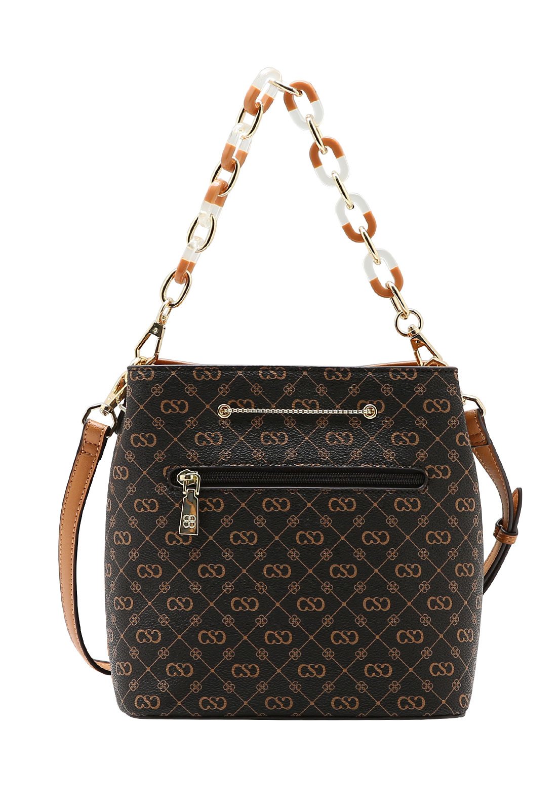 A Bolsa Feminina Chenson Versátil Monograma Elegance combina design moderno e funcionalidade em um modelo sofisticado e cheio de personalidade. Confeccionada em material sintético de alta qualidade, apresenta estampa monograma exclusiva e acabamento impecável. O modelo estilo saco possui fechamento por zíper e ajuste com corrente metálica frontal, garantindo charme e praticidade. Conta com alça de mão em corrente resinada mesclada removível, além de alça longa transversal ajustável e removível, permitindo diferentes formas de uso. Seu interior é espaçoso, com bolso interno com zíper, ideal para organizar os itens essenciais. Possui ainda bolso externo traseiro com fechamento em zíper e acompanha acessório chaveiro espelho, que agrega funcionalidade e estilo ao visual.