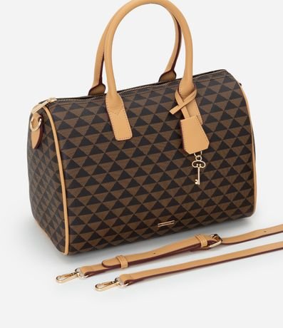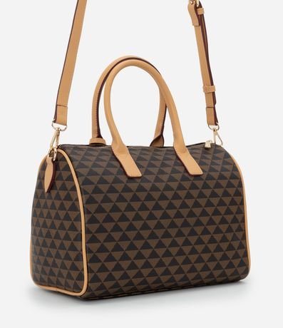 Bolsa feminina em PU confeccionada com poliéster mais sustentável. Possui estampa geométrica de triângulos, formato amplo com alças de mão, fechamento superior por zíper, alça longa ajustável removível e detalhe frontal em chave aplicada.